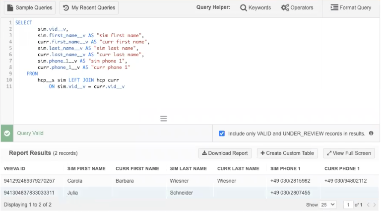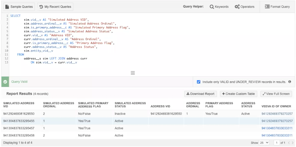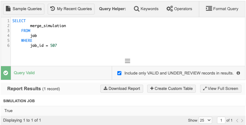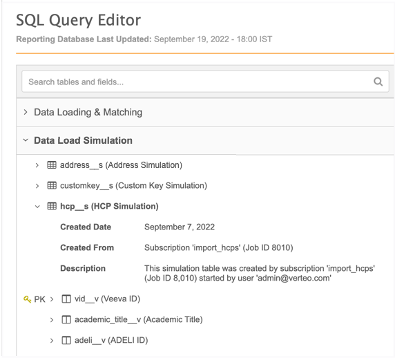 Reporting tables are created for the simulated data in the SQL Query Editor (Reports). Use the tables to generate reports so you can compare the simulated data to the production data in order to understand which changes the job would have made to your data.
