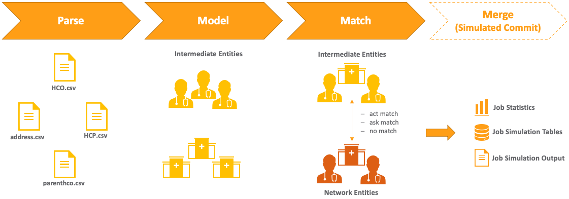When you run a job in simulation mode, the data is simulated during the merge stage. You can preview the results without committing any data to the database.