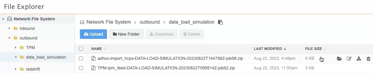 In Network Explorer, a new folder in the outbound directory, data_load_simulation, contains the output files for all simulation jobs.