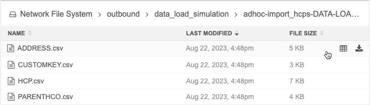 Files - A .zip file is created in the Network file system. It contains a .csv file for each object impacted by the data. For example, if the feed contains updates for HCPs, a .csv file is created for the HCP object and for each of its sub-objects and relationships. The files for all simulation jobs are archived in the FTP folder.