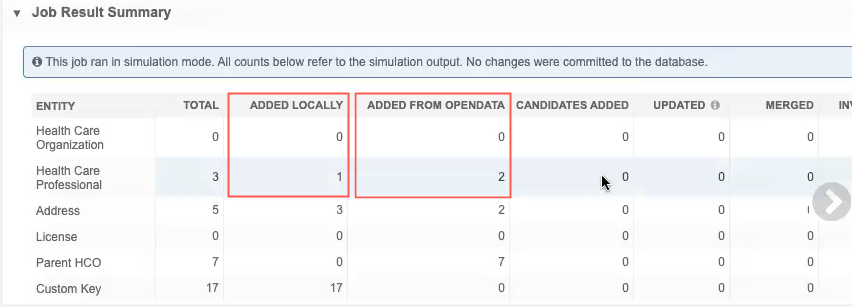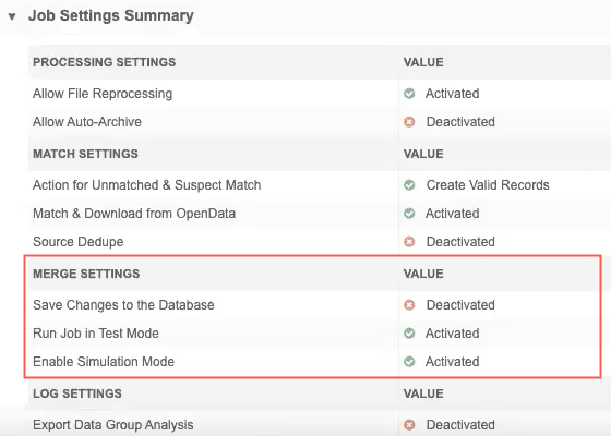 This section is populated with the simulated statistics of the job after the merge stage. A banner displays to assure you that the data is simulated and that no changes were committed to the database.