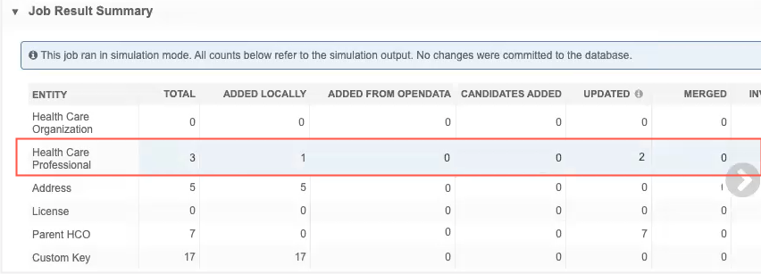 In this job, if the data had been committed to the database, one HCP would have been added as a local record, and two HCPs would have been updated.