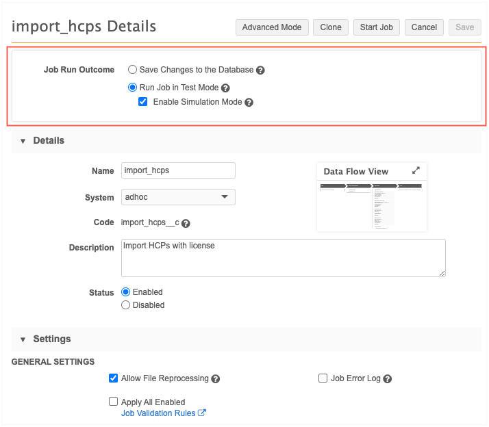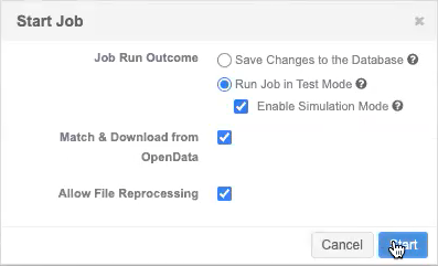 Run Job in Test Mode (Default) - Stop the job after the matching stage so no changes will be applied to the database. You can review the job statistics on the Job Details page.