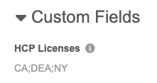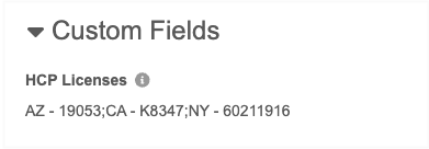 The custom field is populated with a concatenated list of values, <type_value__v> - <license_number__v>, separated by semicolon. If none of the licenses meet the criteria, null is returned.