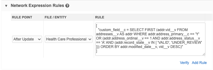 [ "custom_field__c = SELECT FIRST (addr.vid__v FROM addresses__v AS addr WHERE addr.address_primary__c == 'Y' OR (addr.address_ordinal__v == 1 AND addr.address_status__v == 'A' AND (addr.record_state__v IN [ 'VALID', 'UNDER_REVIEW' ])) ORDER BY addr.modified_date__v, vid__v DESC)" ]