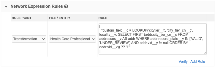"custom_field__c = LOOKUP('citytier__t', 'city_tier_cn__c', locality__v: SELECT FIRST (addr.city_tier_cn__c FROM addresses__v AS addr WHERE addr.record_state__v IN ['VALID', 'UNDER_REVIEW'] AND addr.vid__v != null ORDER BY addr.vid__v)) ?? '1'"
