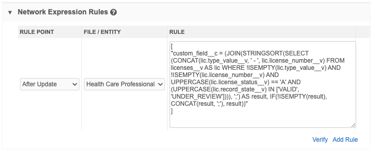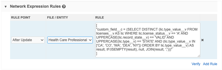 In this example, the rule looks through the licenses for specific states on the record. It populates the field with a concatenated list of those states if the license has the following criteria:
