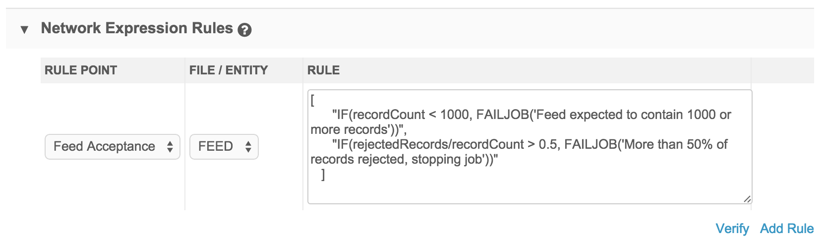 Feed acceptance rules are triggered at various stages of the load, based on the record count at each stage.