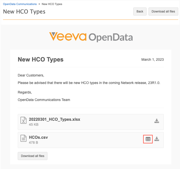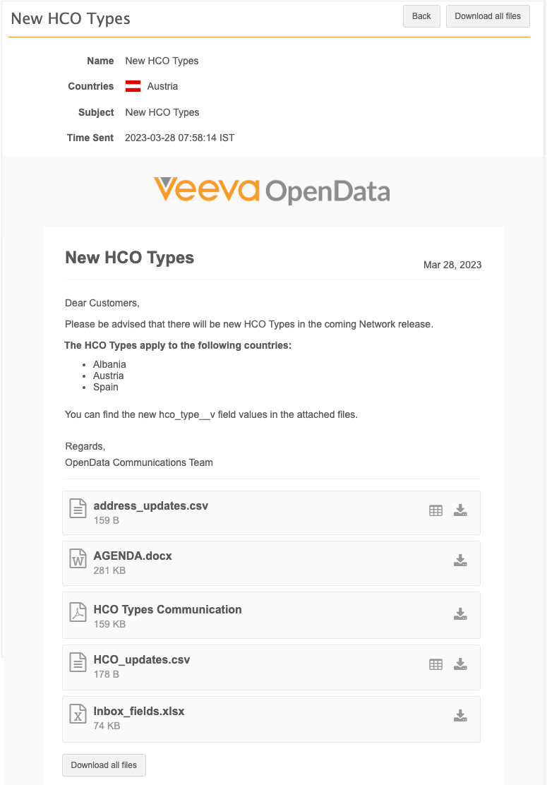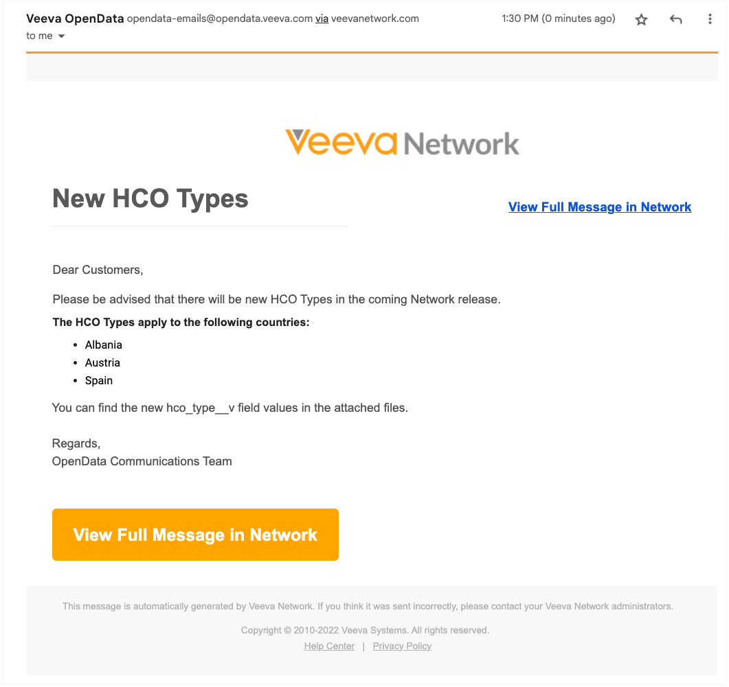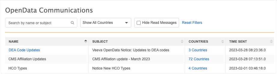 You can view and manage communications from Veeva OpenData in your Network instance. This feature centralizes all notifications from the OpenData team so you can track information and activities and take any required actions.