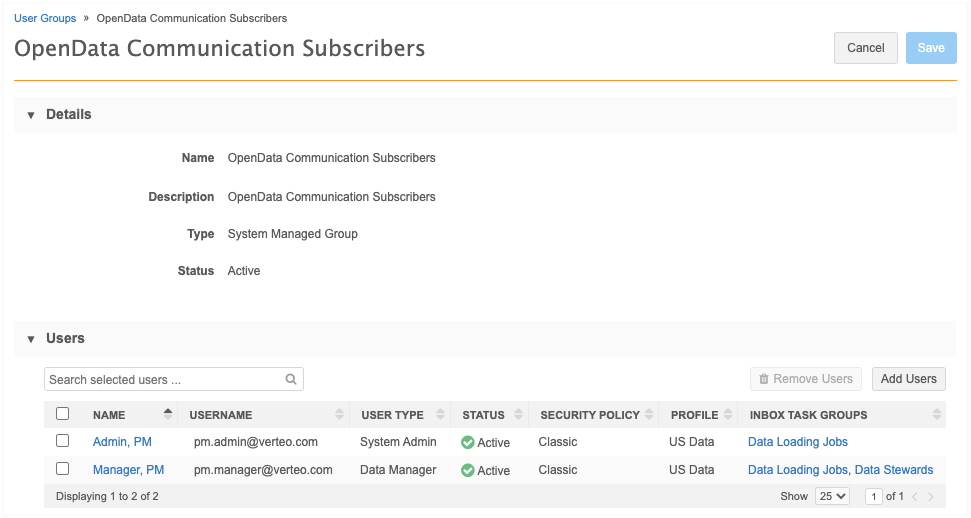 Note: Administrators, Data Managers, and System and Data Admin users can be added to the user group. These are the only users that have access to the OpenData Communications page in the Admin console.