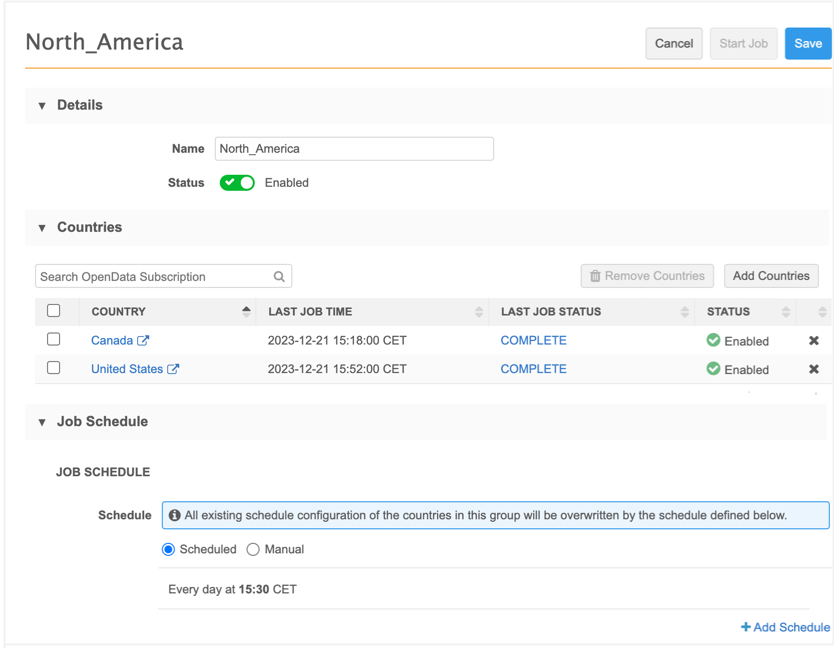 If you subscribe to OpenData for countries that share similar schedules, you can now create a country group to manage them together. This can simplify configurations and save you time from defining individual schedules for each country.