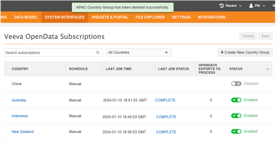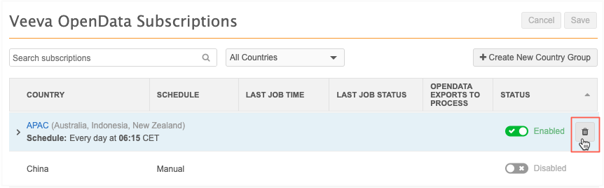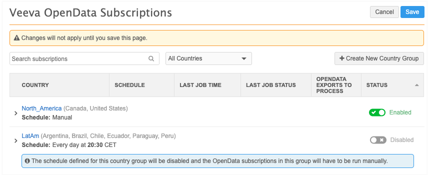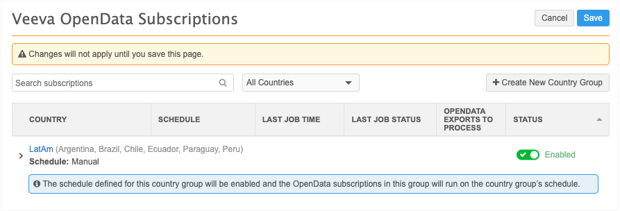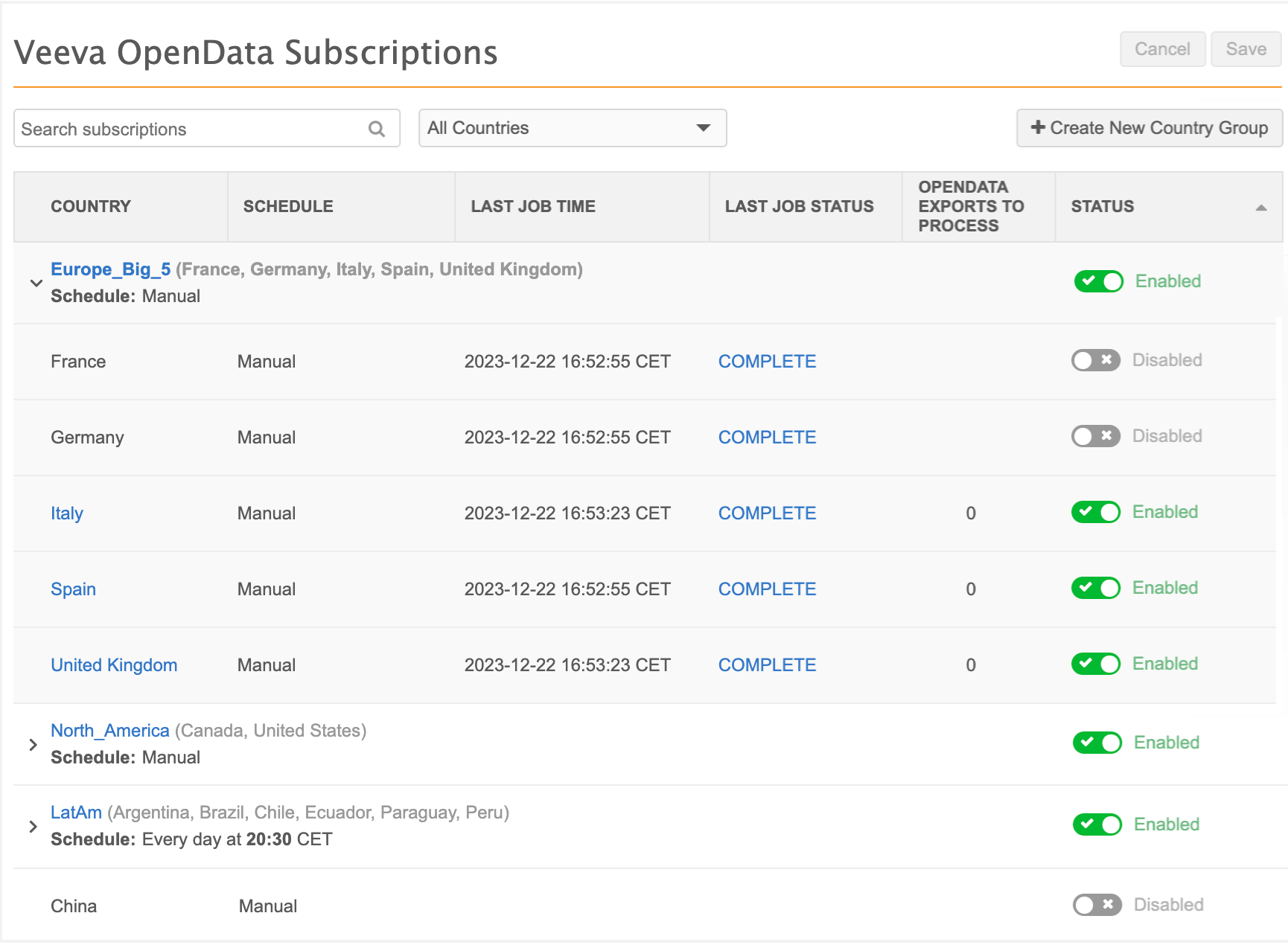 Country groups are enabled by default. If the group was disabled, it can be enabled on the Veeva OpenData Subscriptions page and on the country group configuration.