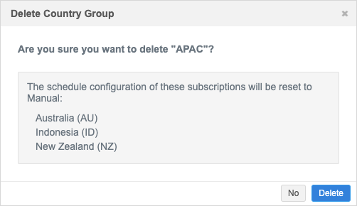 Groups can be deleted from the OpenData Subscriptions page. When a group is deleted, the countries in the group are reset to run manually.