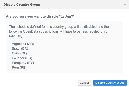 Country groups can be disabled from the OpenData subscriptions page and on the country group configuration.