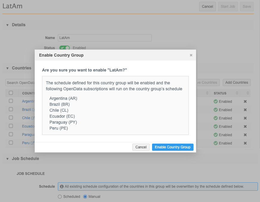 Disabled country groups are set to run manually. After you enable the group, you can define a schedule.