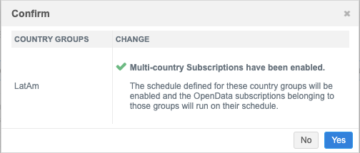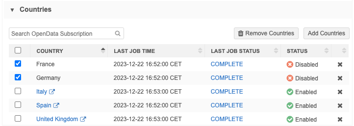 The country group is now disabled. Expand the group on the OpenData subscriptions page to see that the individual country subscription in the group have been set to a Manual schedule.