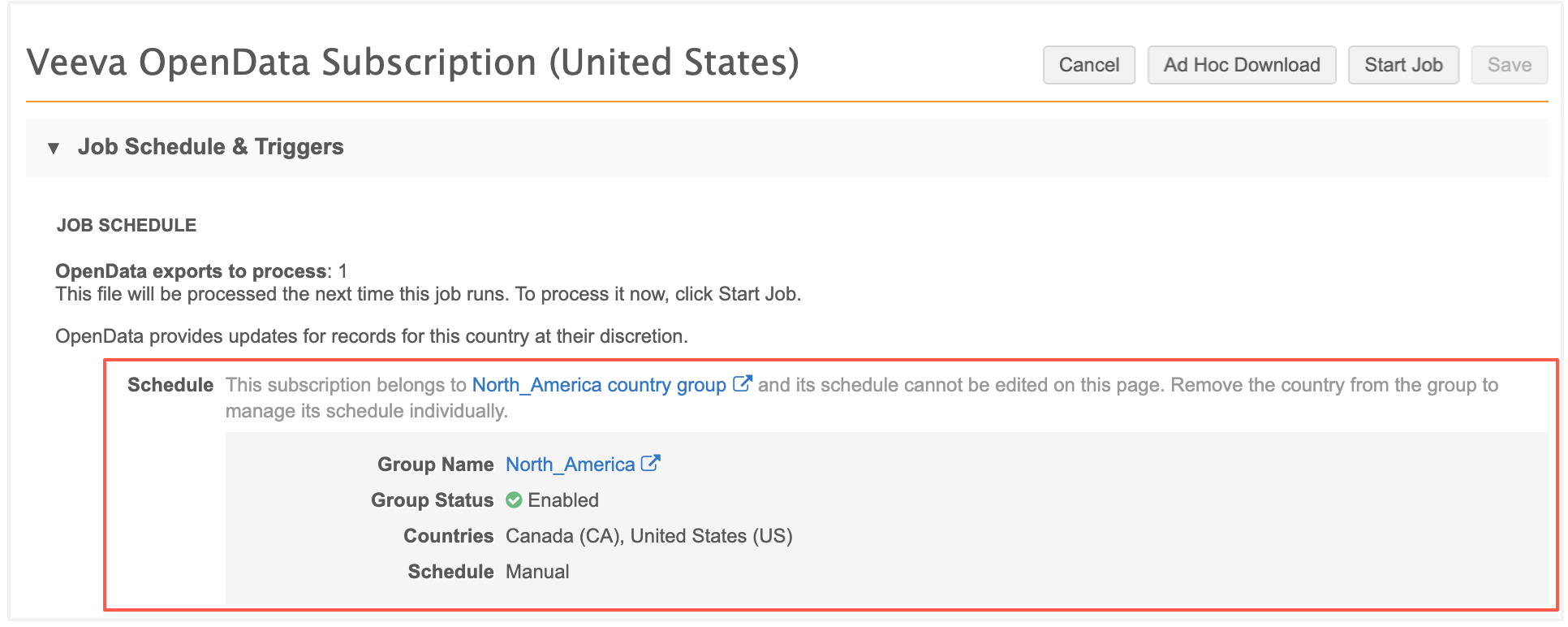 The job schedule on individual country configurations is locked and cannot be edited. A link to the country group displays so you can navigate to the group configuration.