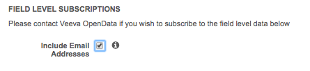 - On the Veeva OpenData Subscription page for that country, in the Field Level Subscriptions section and select Include Email Addresses.