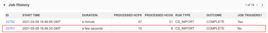 After the job runs, the Job History displays the job ID and the counts of the targeted VIDs in the Processed HCPs/HCOs columns. Regular delta updates and targeted updates are both listed in Job History and aren't distinguishable from each other.