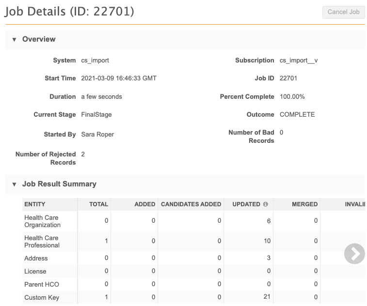 Note: This count is different from the Rejected column in the Job Result Summary. A count in the Overview section reflects records that do not exist in your Network instance. A count in the Job Result Summary reflects records that couldn't be updated by the job.