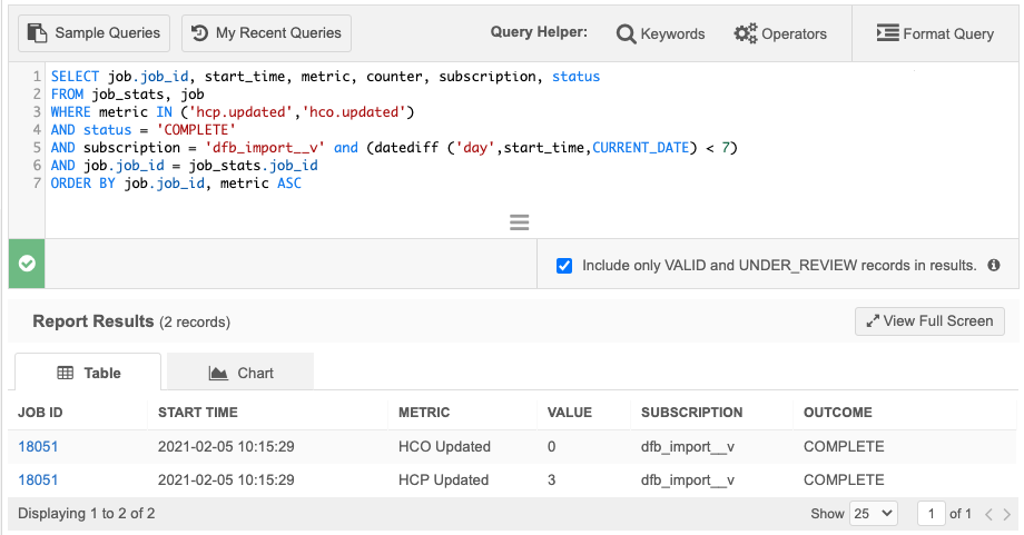 To identify the number of HCPs and HCOs that were updated by a job in your Network instance, you can run a report (Reports > SQL Query Builder).