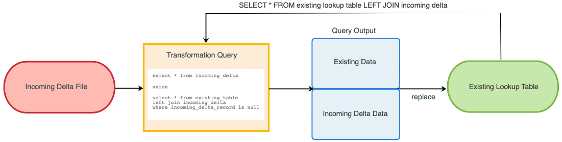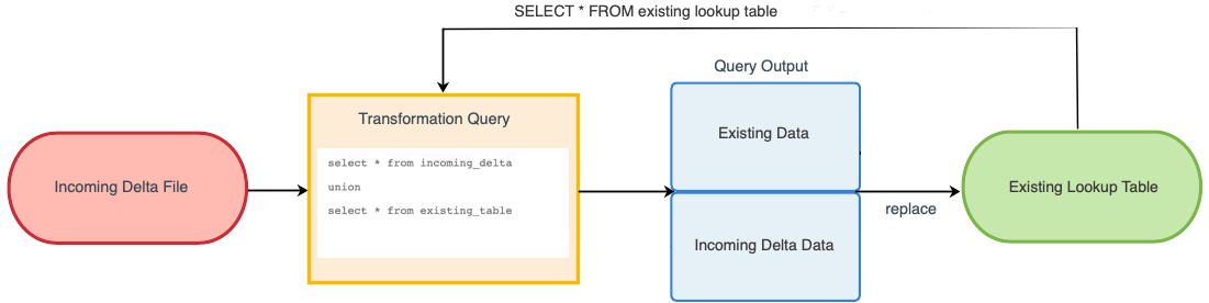 To add new data to the existing lookup table, create a transformation query that will union the incoming data from the delta file with the existing data in the lookup table.