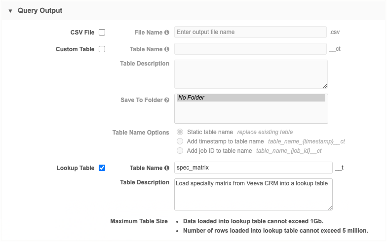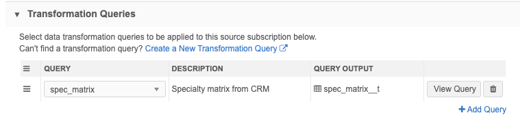 If the transformation query has more than one output type (for example, a lookup table and a custom table), each output type displays in the Query Output column.