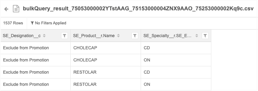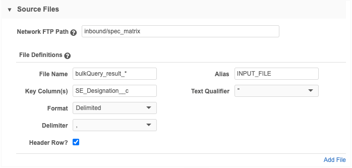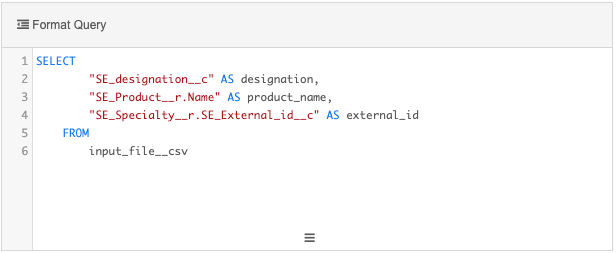 SELECT "SE_designation__c" AS designation, "SE_Product__r.Name" AS product_name, "SE_Specialty__r.SE_External_id__c" AS external_id FROM input_file__csvNote that this query uses the file alias, input_file__csv, that you can define in the source subscription.