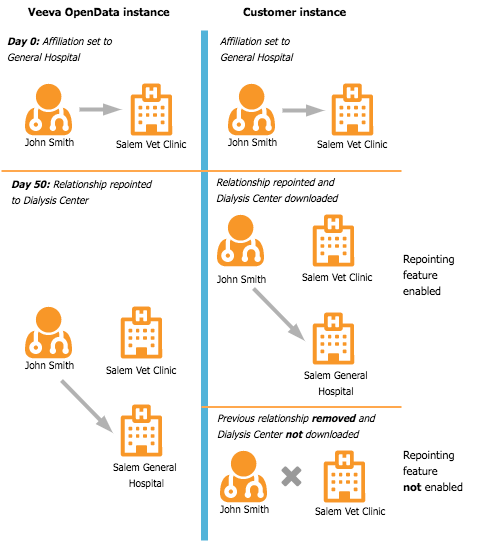 If your Veeva OpenData subscription filters or working set are defined to only download Veterinary HCOs, but a relationship has changed so an HCP now has a Parent HCO that is a General Hospital, the General Hospital will be downloaded to your Network instance so you receive the latest relationship data.