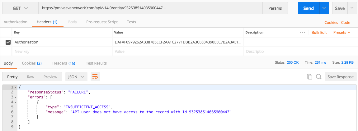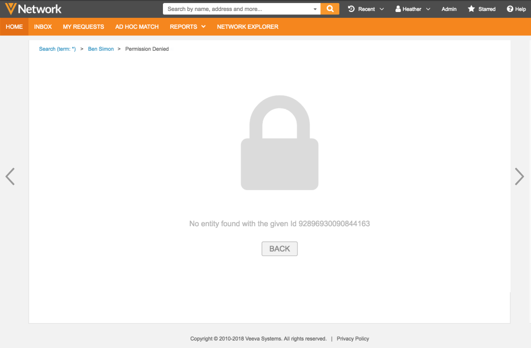 - Profiles - Anonymized records cannot be viewed on the profile page. If you enter the Veeva ID of an anonymized record into the Network URL, the "locked" page with the "No entity found" message displays instead of the record. All related pages (for example, Revision History) are also unavailable for the record. Locally managed anonymized records cannot be reversed.