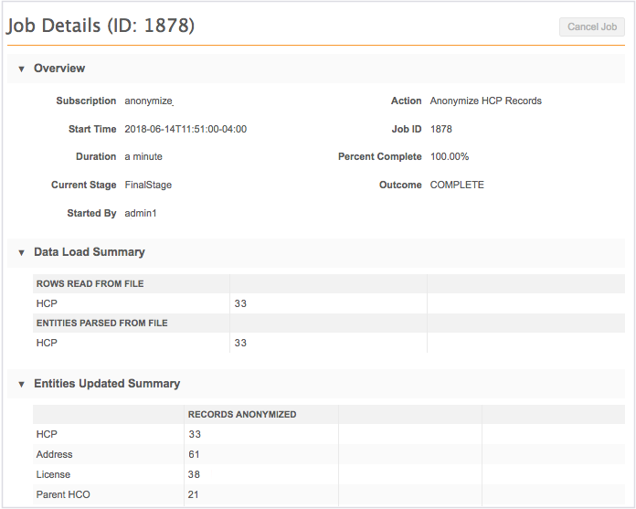 On the Job Details page, review the number and type of records that were anonymized during the job. The Job Error Log section identifies any records that could not be anonymized during the job.