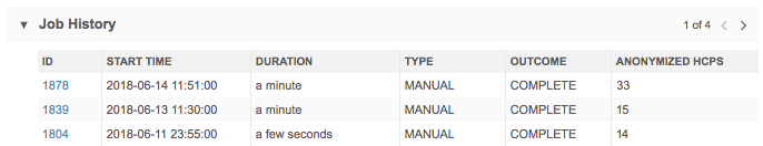 When the job completes, a Job History section displays at the bottom of the page with some summary information about the job.