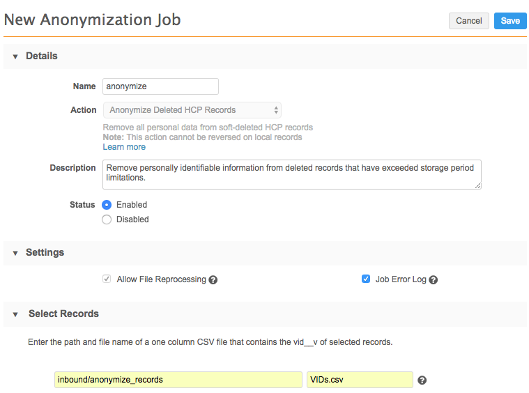 To anonymize records, administrators and data managers must create a .csv file containing the applicable Veeva IDs (VIDs). Locally managed and Veeva OpenData managed HCP records with a record state of Deleted can be anonymized.