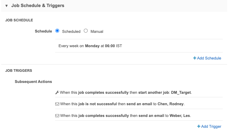 - Send email - Specify users that should be notified for successful and unsuccessful job outcomes.