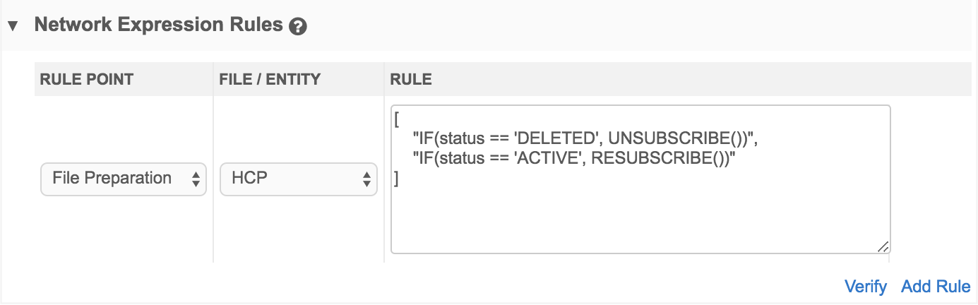 Note: The status field and the DELETED and ACTIVE values are examples. Replace them with the field and value that the third-party data provider uses to indicate that the records are unsubscribed or resubscribed.