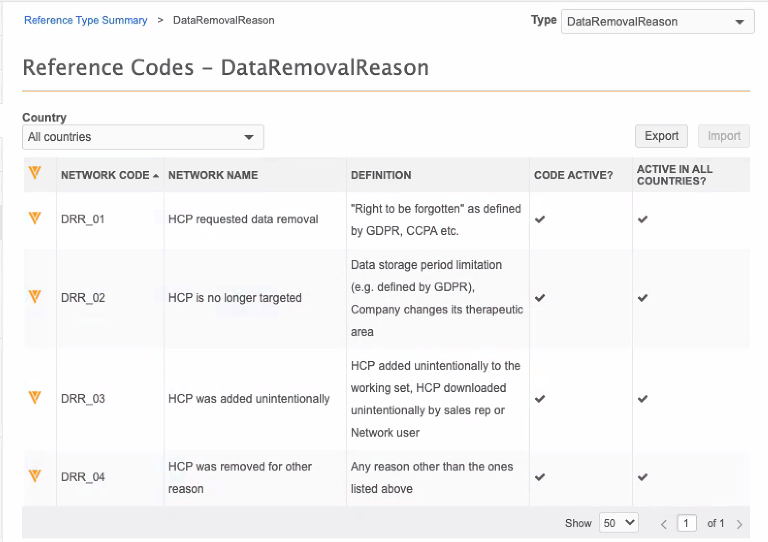 You can export a list of all records removed from your Network instance, including the data removal reason for each HCP/HCO. Anonymized HCPs are included in target subscriptions.