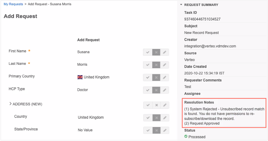 Users can view the resolution note to understand why the add request was rejected.