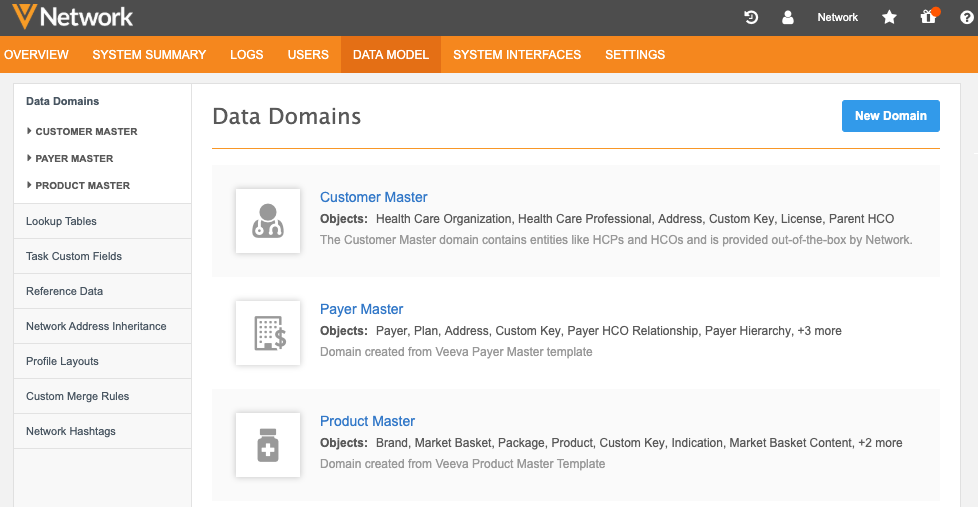 The Data Domains page displays, showing the default Custom Master domain and any custom domains that you have created in your Network instance.
