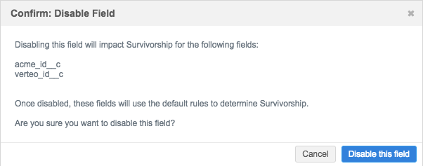 If a field that you are using as a Dependent Field to determine survivorship for alternate keys is going to be disabled, a confirmation dialog displays. The dialog contains the impacted fields.