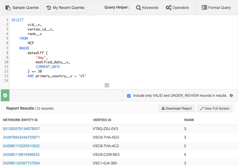 You can also use Network reports to query the applicable records for the required data. For example, if you know that there was a problem with merged HCPs within the past month, you could run the following query to find the HCPs that were updated within the last 30 days.