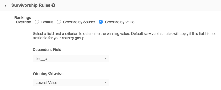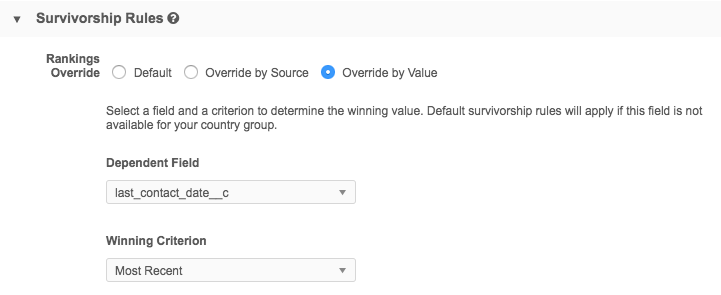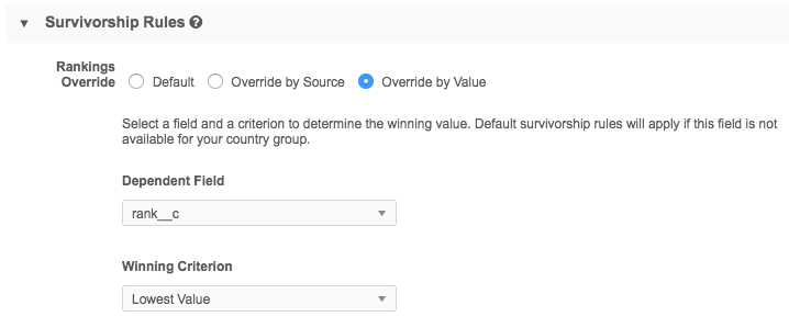 4. In the Survivorship Rules section, select the Override by Value option.