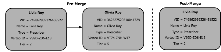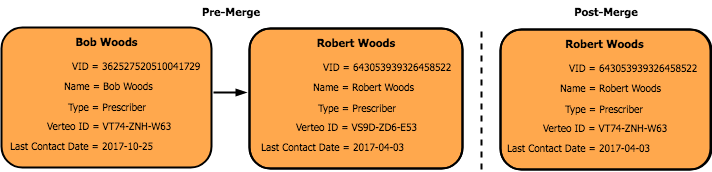A Veeva OpenData data steward merges two records together (Bob Woods into Robert Woods) in the OpenData master instance. When the record comes down to Verteo's customer instance during an OpenData subscription job or an ad hoc download, the records are updated and the merge is performed there.