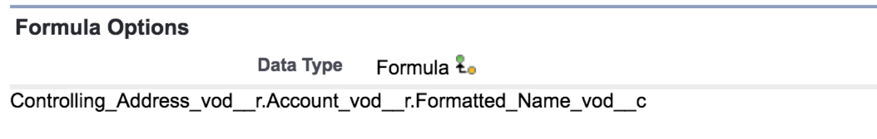 With controlling_address_vod__c and controlled_address_vod__c populated, customer can also get additional information about the parent HCO easily. For example, a custom formula field can be created in CRM with the following formula option to retrieve the name of the parent HCO.