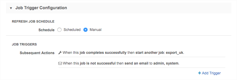 5. In the Job Trigger Configuration section, define the schedule for the job and any subsequent actions that will start when this job finishes.
