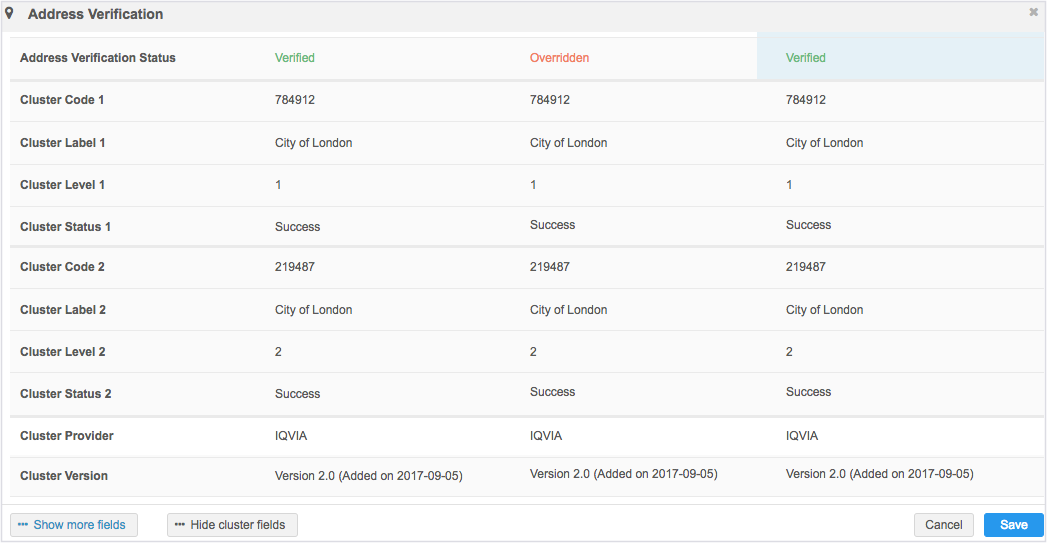 In the Address Verification dialog, Data Stewards can click Show cluster fields to preview the cluster information.