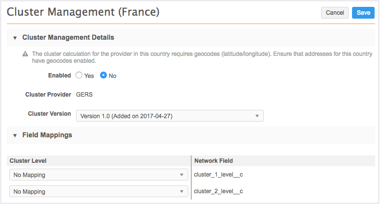 If the cluster codes rely on geocodes, a warning message displays to remind administrators that geocodes (latitude and longitude) are required for this cluster provider. Geocodes are supported for all countries.