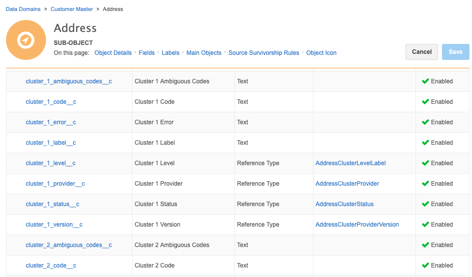To view the fields used for cluster management, in the Admin console, click Data Model and choose the Customer Master domain. Select the Address object to view the cluster fields.