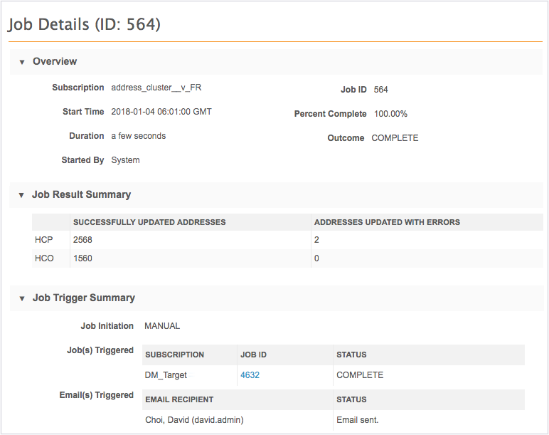 After running a data maintenance job to refresh addresses, administrators can view the job details to see the counts of addresses that were updated. To open the Job Details page, in the Job History section on the Cluster Management page for the country, click the Job ID.