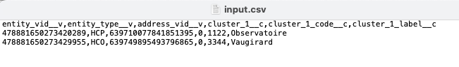To update the cluster fields on two addresses, add the Veeva ID of the HCP or HCO records and the addresses.