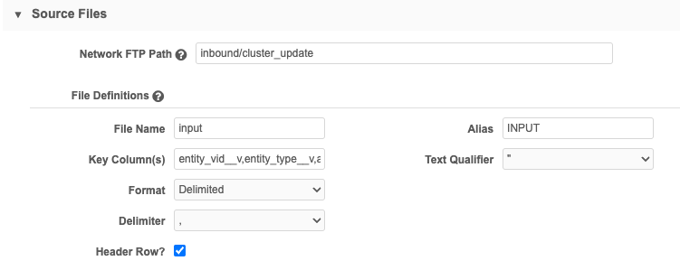 • Header Row?: Select the Header Row checkbox to indicate that a comma separated list of headers exists for the header row.